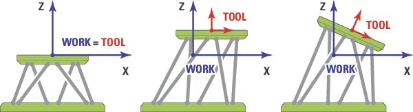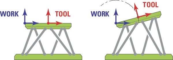 Hexapod motion is defined by a global coordinate system and a local coordinate system, making programming motion more intuitive for standard research, metrology and manufacturing applications. Users can program up to two virtual pivot points without calculating coordinate system transformations or powering down the controller. The two virtual pivot points are origins of the two definable coordinates systems: Tool, which moves with the top plate, and Work, which is a stationary reference. This allows the user to conceptualize how the sample and tool are manipulated. For this 6-axis device, complex motion is simplified for easy user program development.