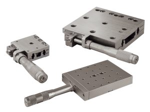 Linear translation stages are designed to constrain motion to an ideal straight line and can be combined to create xy, xz or xyz multi-axis motion configurations. We combines our precision linear adjustment screws and micrometer actuators with advanced bearing configurations and precision machined surfaces to create the manual linear stages required by top researchers and OEM suppliers. Careful consideration is given to anything that can contribute to deviations from ideal linear motion. This includes stage material stiffness, thermal expansion, thermal conductivity, machining tolerances, bearing or flexure design, and linear actuator choice.