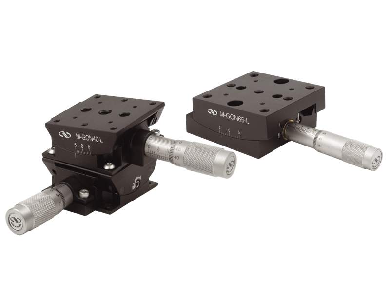Like-sized GON Series stages can be stacked. In a stacked configuration, the axes of rotation will intersect with each other allowing for rotation that is not restricted to a plane but is truly spherical. The motion on both goniometers can be securely locked using a hex screw on the side of the goniometer.